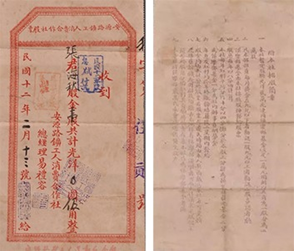 江西萍鄉(xiāng)煤礦自1898年開(kāi)辦起,安源工人便在經(jīng)濟(jì)上深受剝削,礦局拖欠工資,奸商哄抬物價(jià)。為了維護(hù)工人利益,減少商人的中間盤剝,1922年5月中國(guó)共產(chǎn)黨領(lǐng)導(dǎo)的安源路礦工人俱樂(lè)部成立不久,便于同年7月創(chuàng)辦了中國(guó)工人階級(jí)最早的經(jīng)濟(jì)組織——安源路礦工人消費(fèi)合作社。隨著規(guī)模和經(jīng)營(yíng)范圍進(jìn)一步擴(kuò)大,消費(fèi)合作社流轉(zhuǎn)資金嚴(yán)重不足,出現(xiàn)了貨品短缺的窘境。為了解決資金不足的問(wèn)題,1923年初,消費(fèi)合作社決定在俱樂(lè)部部員中招股,制定了《招股簡(jiǎn)章》。工人們深信消費(fèi)合作社就是為大家謀利益的經(jīng)濟(jì)實(shí)體,盡管十分困難,仍踴躍認(rèn)購(gòu)股票,很快就籌集到股金7800余元,連同俱樂(lè)部撥來(lái)的活動(dòng)經(jīng)費(fèi)一起,共計(jì)資金1.8萬(wàn)余元。消費(fèi)合作社給每位認(rèn)股者發(fā)了自行設(shè)計(jì)的股票作為憑證。