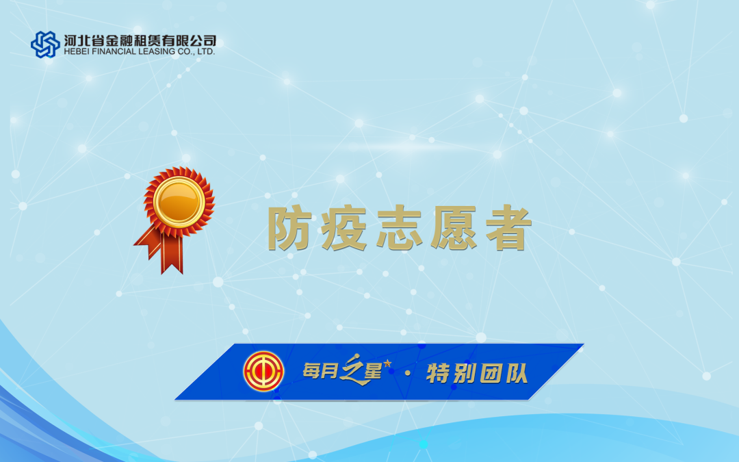 8月份,河北金租一方面抓業(yè)務(wù)促投放,積極創(chuàng)新業(yè)務(wù)模式和打磨服務(wù)產(chǎn)品,一方面積極落實(shí)區(qū)域防疫政策,以責(zé)任傳遞租賃溫度,為疫情防控貢獻(xiàn)力量。工會(huì)委員會(huì)評(píng)選出本月“每月之星”,請(qǐng)優(yōu)勝團(tuán)隊(duì)和優(yōu)秀員工珍惜榮譽(yù),再立新功,請(qǐng)全體干部員工以先進(jìn)為榜樣,再接再厲,再創(chuàng)佳績(jī)